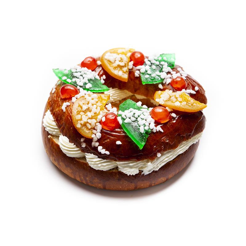 Brioche de doble fermentación relleno de nata montada. Decorado con fruta confitada y azúcar perlado. Con rey y haba