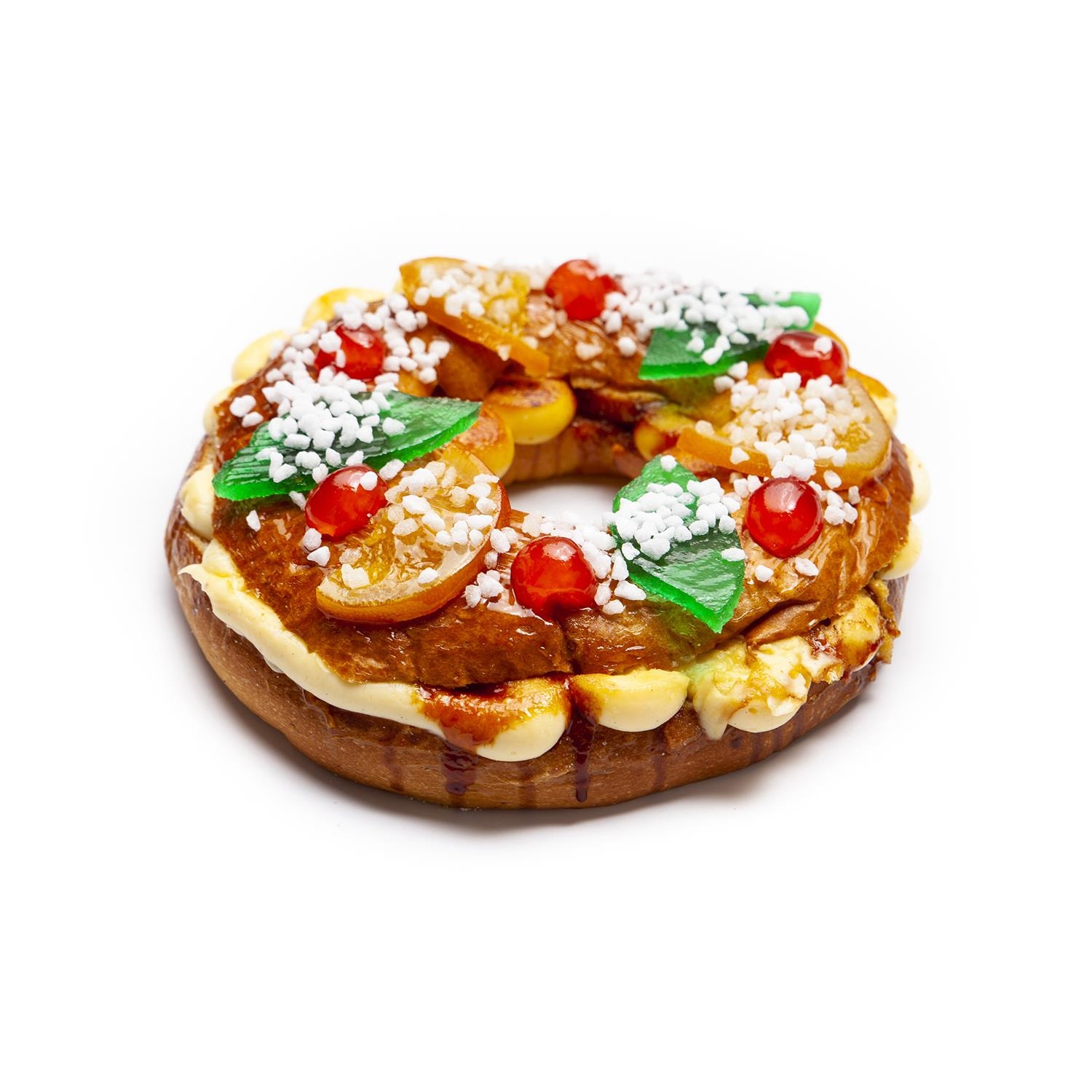 Brioche de doble fermentación relleno de nuestra crema quemada. Decorado con fruta confitada y azúcar perlado. Con rey y haba